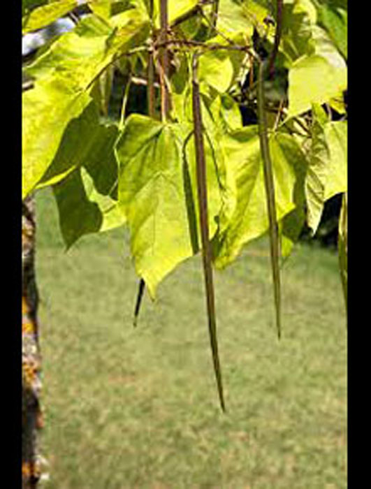 Le Catalpa bignonioides Aurea est un arbre à feuilles caduques, connu pour son feuillage doré lumineux et ses grandes feuilles en forme de cœur. Il produit des fleurs blanches en grappes en été et est souvent utilisé comme arbre ornemental dans les jardins.