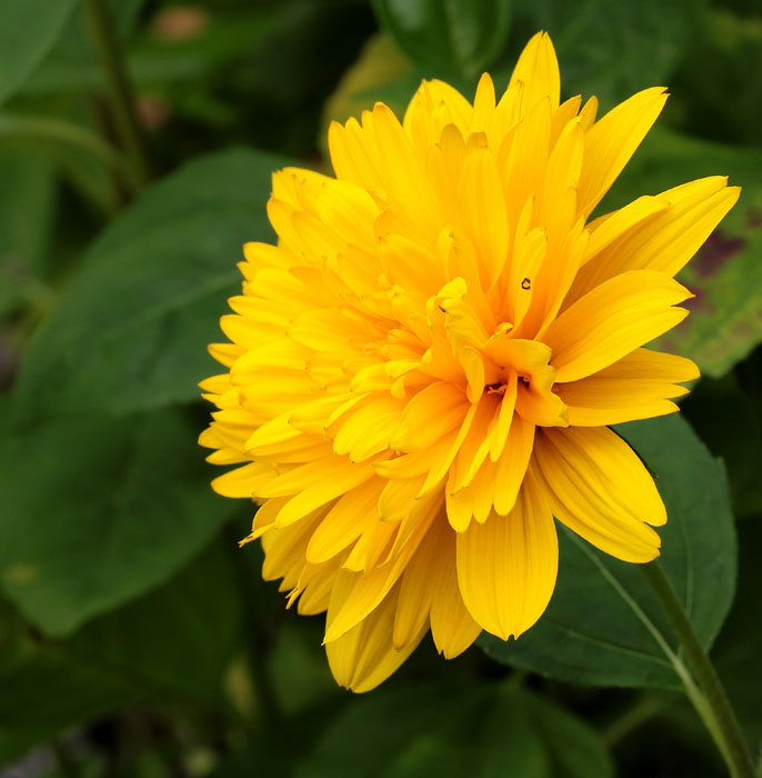 Variété ancienne avec des fleurs très doubles jaune d'or, presque en forme de pomponette ; idéale pour un sol de jardin riche et frais, en plein soleil.