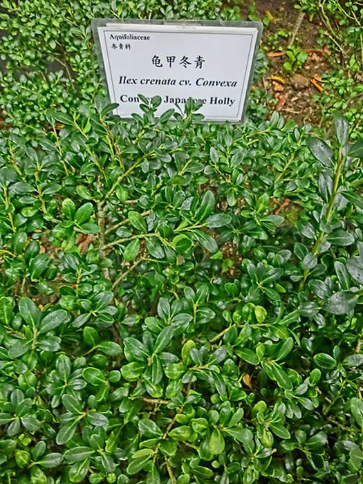 Ilex crenata Convexa est un arbuste persistant à feuilles petites, ovales et convexes, souvent utilisé pour la formation de haies ou en topiaire, comme en boule.