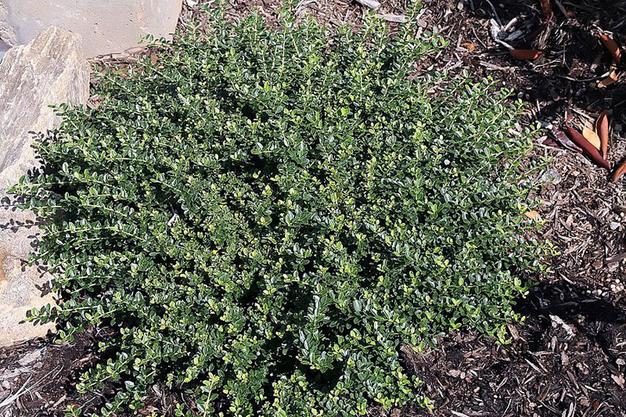 Houx compact aux petites feuilles lustrées de couleur vert moyen, produisant quelques fruits noirs. Sujet femelle, cette variété rappelle le buis à grosse feuille et préfère les sols bien drainés et limoneux.