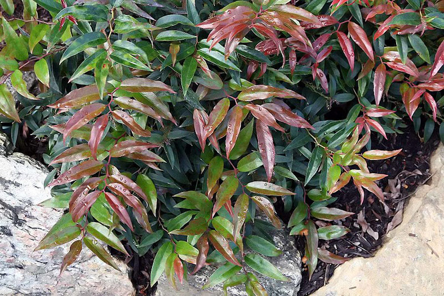 C'est un petit arbuste à port étalé, avec un feuillage brillant vert et rouge, et des grappes de fleurs blanches très décoratives.
