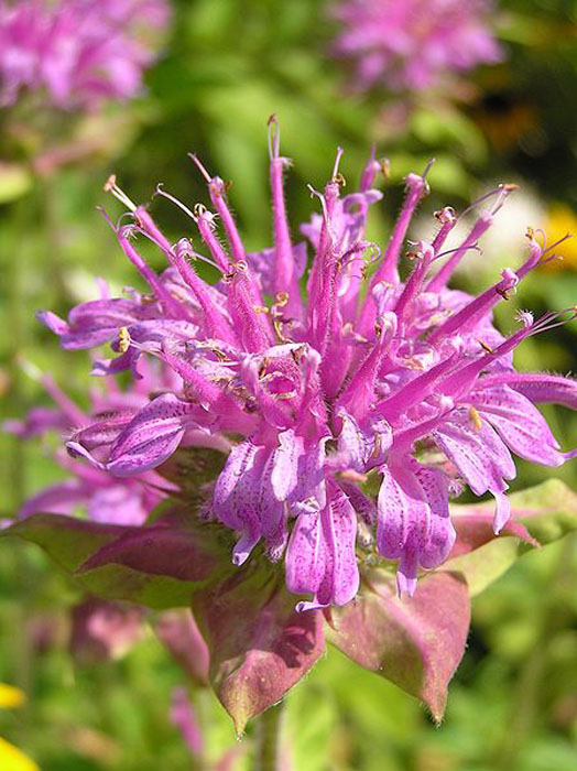 Floraison en retard, avec des fleurs allant du mauve au violet clair, entourées de bractées violettes. L'inflorescence en forme de toile d'araignée est composée de pétales échevelés autour d'un cœur distinct, reposant sur le feuillage aromatique.