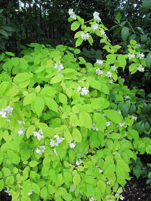 Petit arbuste à port globulaire et compact, célèbre pour son feuillage jaune, plus vif en plein soleil, qui devient vert au milieu de l'été. Fleurs blanches parfumées en juin. Croissance lente. Très lumineux dans un jardin.