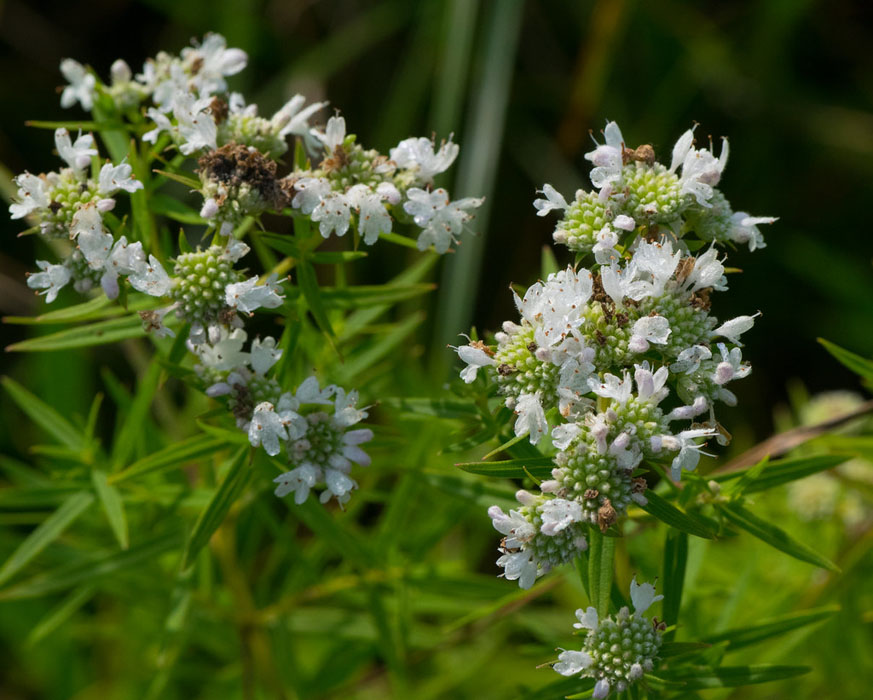 Plante vigoureuse avec des feuilles duveteuses, très aromatiques, exhalant un parfum de menthe poivrée. Ses fleurs en forme de couronne sont blanches.