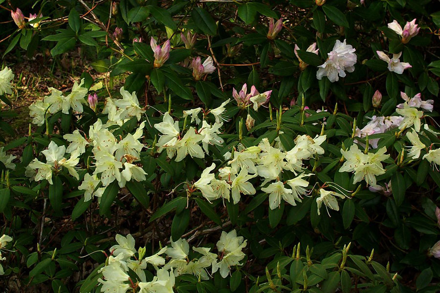 Le Rhododendron DwerG Shamrock est un arbuste à feuilles persistantes, compact, avec des fleurs jaune pâle en forme de cloche qui apparaissent au printemps. Il est idéal pour les petits jardins ou les rocailles.