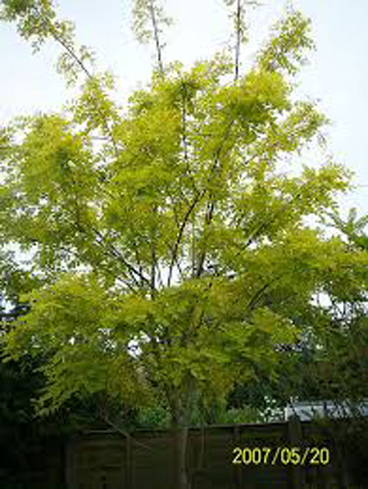 Un magnifique arbre à feuilles caduques avec une structure aérée et un feuillage luxuriant, léger, jaune doré au printemps, vert jaunâtre en été et jaune orangé en automne. Ses fleurs blanches et mellifères apparaissent en grappes pendantes et très parfumées au printemps. Rustique, il s'adapte à tout type de sol, même pauvre et sec en été une fois bien établi. Il a quelques épines.
