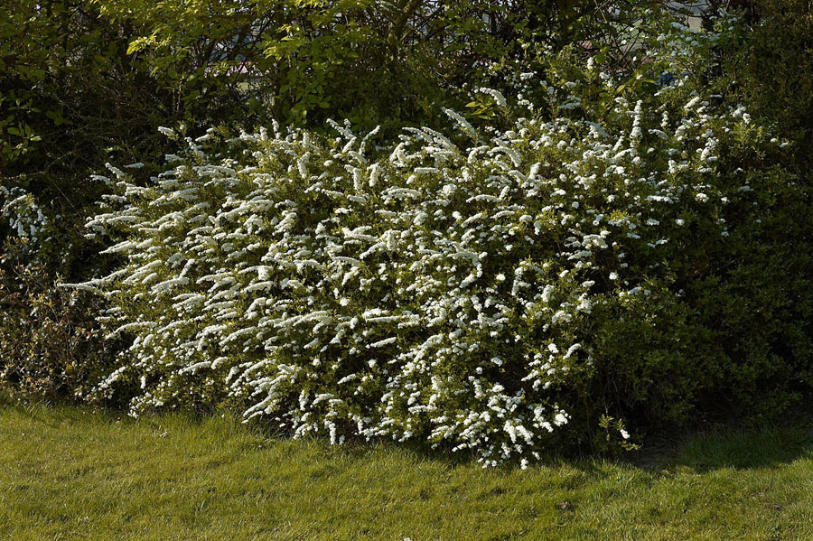 Arbuste dense avec de longues tiges flexibles et pendantes. Une multitude de petites fleurs blanches fleurissent tout le long des tiges. Extrêmement florifère.