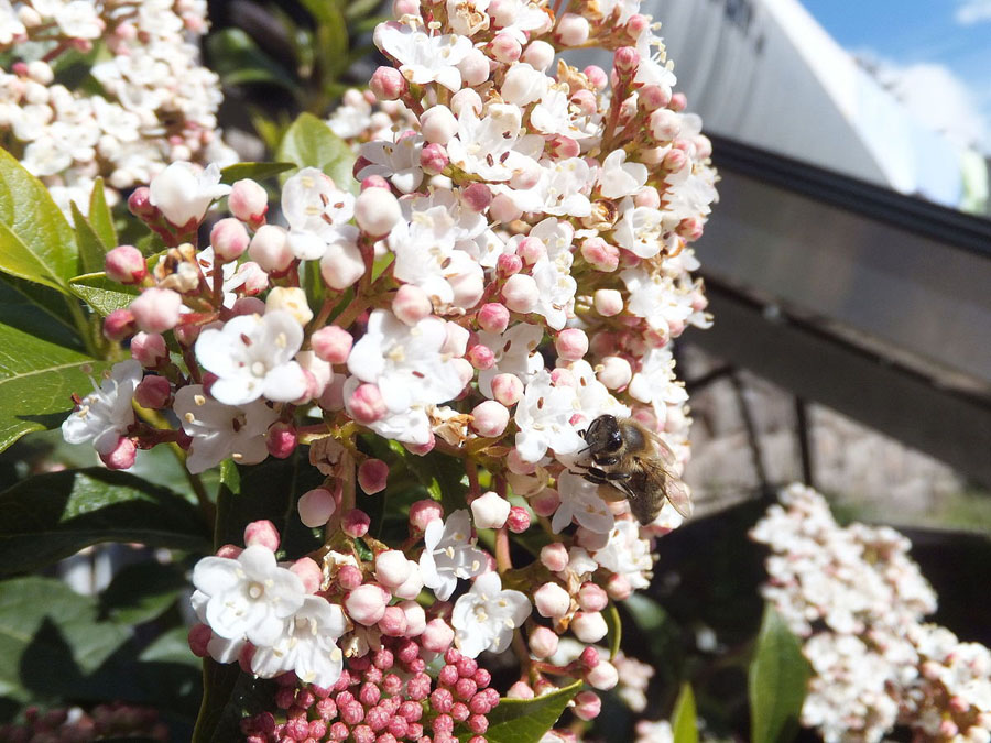 Viburnum tinus Gwenllian est un arbuste persistant avec des feuilles vert foncé et des fleurs blanches ou roses en grappes, suivies de baies bleu-noir.
