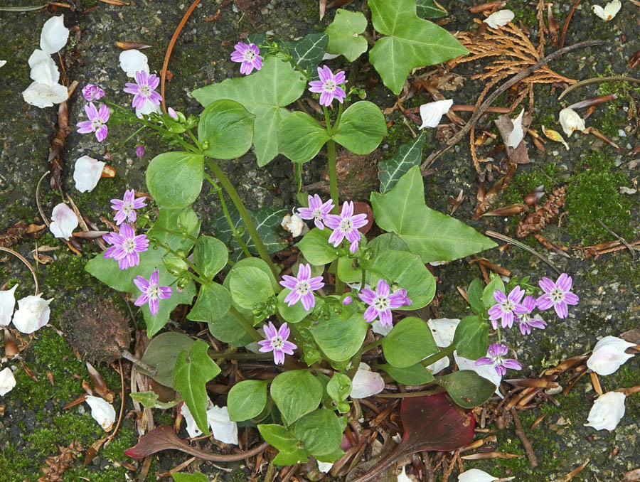 Montia sibirica, ou claytonie de Sibérie, est une plante herbacée vivace à petites fleurs roses ou blanches, originaire d'Amérique du Nord et d'Asie du Nord-Est, souvent trouvée dans les zones humides et ombragées.