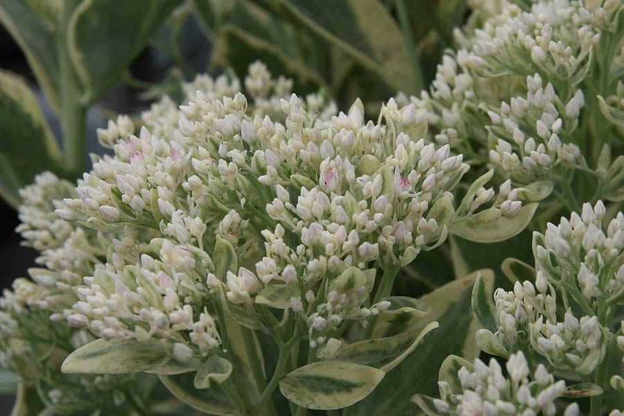 Sedum hybride Frosty Morn est une plante succulente vivace avec des feuilles charnues vertes bordées de blanc crème et des fleurs roses en été. Elle est résistante à la sécheresse et idéale pour les jardins de rocaille.