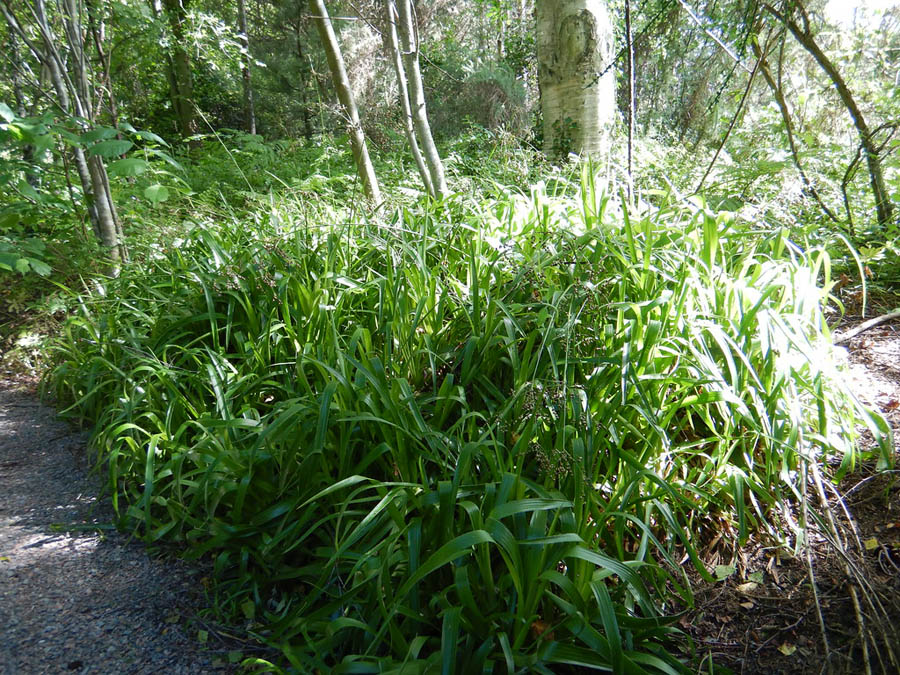 Luzula sylvatica Bromel est une variété de grande luzule, une plante vivace herbacée formant des touffes denses de feuilles vertes, larges et brillantes, souvent utilisées comme couvre-sol dans les jardins ombragés.